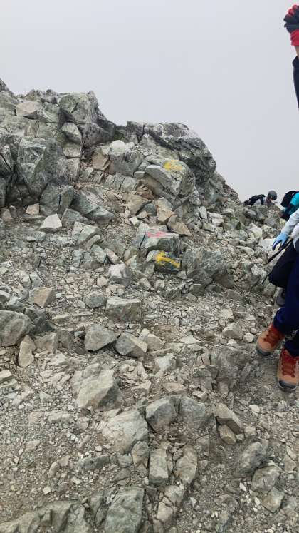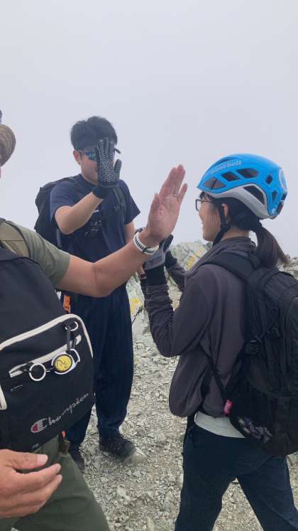 先頭のグループが雄山山頂に登頂しました。喜びのハイタッチ。