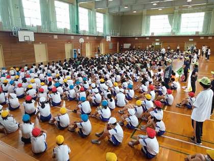 地震の際の安全確保行動「まず低く、頭を守り、動かない」を身につける訓練に真剣に取り組み、体育館に集まって「予測できない地震にどう対応するか」を改めて学び直しました。