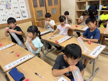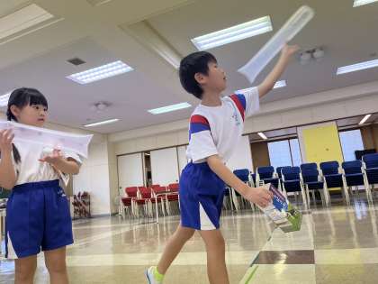 1学年の生活科では「とばしてみよう!かさぶくろけっと」の学習をしています。傘袋に空気を入れて、ランチルームでとばしてみました。すると、「もっと遠くに飛ばしたい」「上に高く飛ばしたい」と子供たちから、願いがでてきました。自分の「かさぶくろけっと」に画用紙やテープ、牛乳パック、段ボールなどをはさみで切って、縦につけたり、横につけたり、大きさや形を変えて何度も試行錯誤しながら作っています。活動を積み重ねていく中で、願いやイメージが膨らみ、活動への意欲が高まっています。