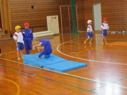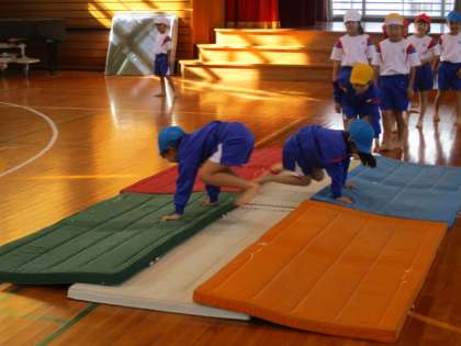 いくつものコースを自分で選びながら、楽しくマット遊びに取り組んでいます。