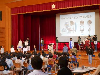 「グー・ペタ・ピンでよい姿勢」をテーマに、保健委員会の児童が発表しました。