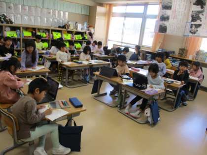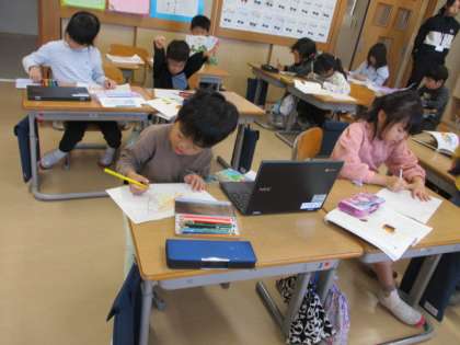 1年生 国語科「しらせたいな みせたいな」 公開日 2023/11/09 更新日 2023/11/09 1年生 クロムブックのカメラで撮った、おうちの人に知らせたい物を、紙に描いて特徴を書き込みました。