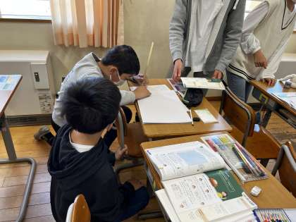 算数科の学習では、「画用紙300枚を全部数えないで用意する方法」を考えました。画用紙の枚数が増えると、それに伴って変わるものは何か、実際の画用紙を使いながら友達と話し合いました。「重さが変わるから1枚分の重さを知りたい」「厚さが変わるけれど、1枚分の厚さは持っているものさしで測ることができない」「10枚くらい重ねてから厚さを測るのはどうかな?」など、比例の考え方を使うために必要な情報をどのように手に入れるか積極的に考える姿が見られました。