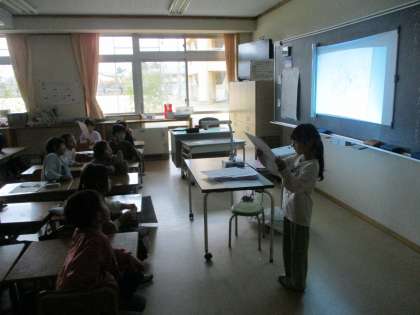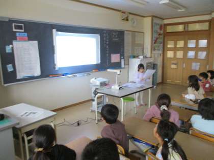 1年生は、国語科「しらせたいな、見せたいな」の学習で、学校のお気に入りの場所や物、生き物等を家族に紹介する文章を書いています。書き上がった絵と文章を家の人に発表する練習をしました。学校のうさぎや鉄棒等、一人一人が好きな物の色や大きさ、手触り等の特徴を絵や文章に表し、発表することができました。