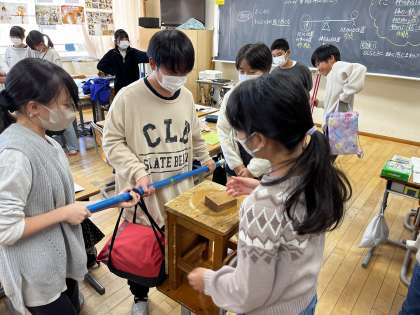 理科の学習では「てこのはたらき」の学習を行っています。簡単なてこ装置を作成して「重さは変わってないのに、軽く感じるのはどんなときか」班毎に実験しました。