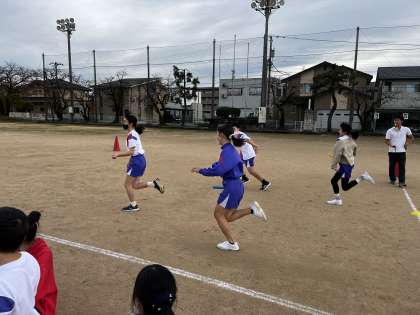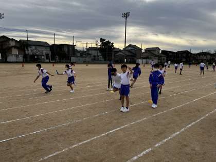 体育科の学習で、リレーを行っています。3〜4人のチームを組み、個人タイムの合算よりも、リレーの記録が速くなることを目標に練習をしています。走り出すタイミングや走順について班毎に互いに相談しながら練習に取り組む姿が見られました。