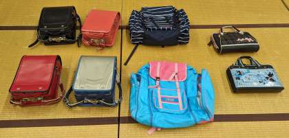 スニーカーや長靴、雨合羽、ランドセル、大リュック、習字道具、文房具など、多くの提供品が集まりました。