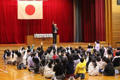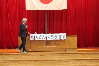 校長先生のお話では、上手なキャッチボールとうまくいかないキャッチボールを例にし、自分の思いをどのように伝えるか、相手の思いのどのように受け取るかの大切さについて教えていただきました。自分を自分で変えるために「たくさんくろうする」ことでも教えていただきました。
