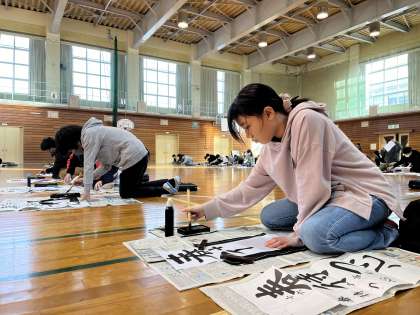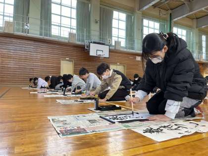 書き初め大会がありました。練習の成果を発揮し、力強く揮毫していました。