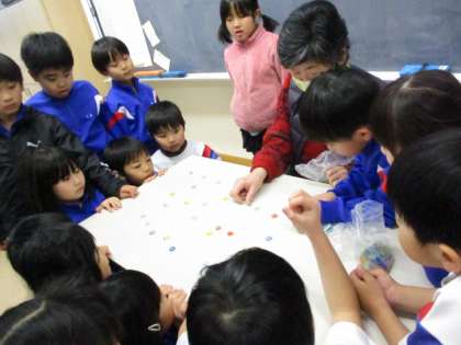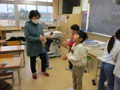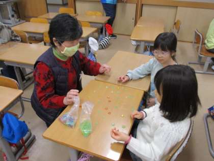 1年生 伝承遊び(4) 公開日 2024/01/18 更新日 2024/01/18 1年生 「おはじき」や「こま」、「お手玉」など、日頃使っていないおもちゃで遊ぶことに、夢中になっている子供たちでした。これから、もっとたくさん遊んで上達するのが楽しみです。