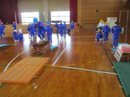 跳び箱の上に乗ったり下りたりしながら、跳び箱に親しみました。ポーズまでしっかりと取り組んでいます。