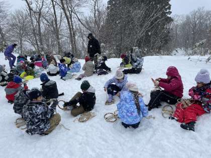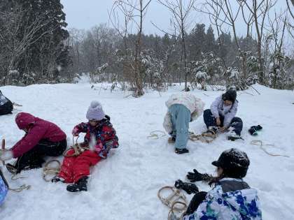 3年生雪上体験2 公開日 2024/02/05 更新日 2024/02/05 3年生 チューブそりで坂を滑っている横で、かんじきを履いて雪の中を歩きます。学校で練習したけれど、かんじきを履くことに苦労していました。