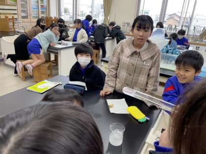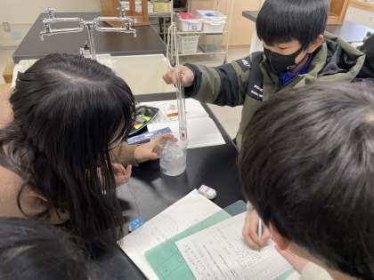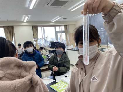 「水のすがたと温度」の学習では、氷と食塩水を使って試験管の中の水を冷やし、氷になる過程を観察する実験を行いました。