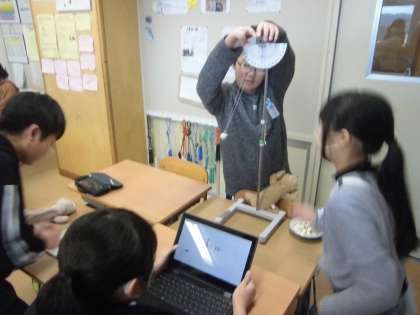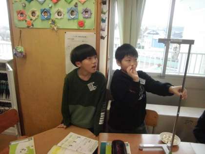 ふりこの実験を行いました。 様々な角度からおもりを離し、1往復する時間を調べました。