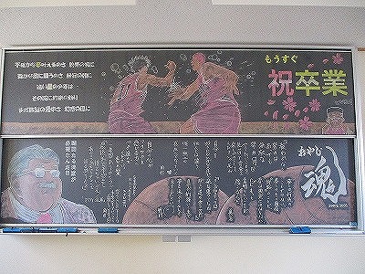 チョークの色や塗り方の工夫して人気のキャラクターを見事に描いていただきました。担任からのメッセージも入り、卒業生に向けて最高の贈り物となりました。おやじの会のみなさん、ありがとうございました。