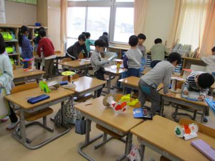 ころころと、転がして遊ぶ作品を作りました。転がり方や飾りを工夫して、楽しい作品に仕上がりました。