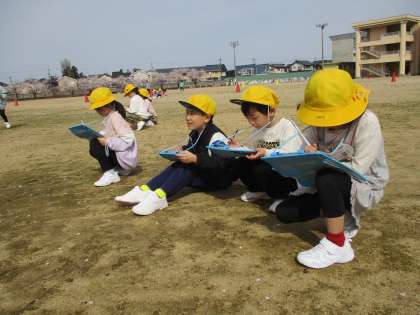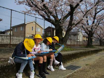 【2年生】生活の様子6 公開日 2024/04/11 更新日 2024/04/11 2年生 グラウンドにはきれいな桜がたくさん咲いています。みんなで外に出て、お花見スケッチを行いました。友達と楽しく桜をよく見ながら、すてきな絵を描くことができました。
