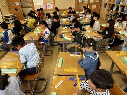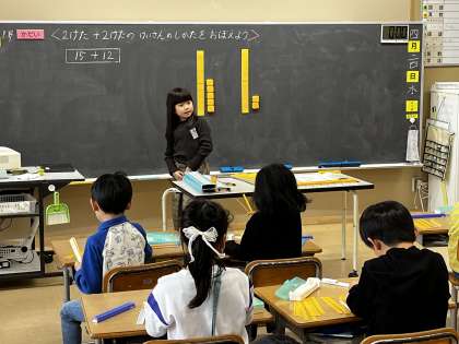 算数科では、子供たちで学習が進める時間を設けています。2桁+2桁の計算の仕方を、10のまとまりやバラのブロックを使って、みんなに説明しました。説明を聞く子供たちは、自分の操作や考えと同じか確かめるために、友達の話を一生懸命に聞いていました。