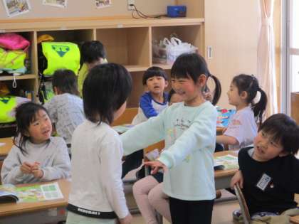 挨拶によって自分や相手が気持ちよくなることについて話し合いました。その後、教室内で、友達に挨拶をしたり、ハイタッチをしたりして、挨拶のよさを感じていました。
