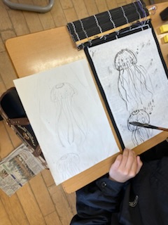 6年生 水墨画 公開日 2024/05/01 更新日 2024/05/01 6年生 図画工作科の学習で、墨を使って絵を描いています。濃淡を意識したり、構図を考えたりする等工夫して作品づくりをしています。