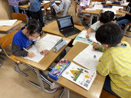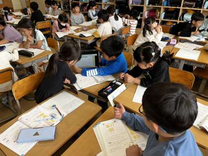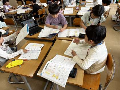 繰り上がりのある筆算のやり方を、グループで話し合って互いに教え合いました。教科書にあるQRコードをChromebookを読み取ると、繰り上がりの仕組みが分かる動画や、教科書の問題の答え合わせができるようになっています。ICTを活用しながら、自分たちで学びを進めようと協力する姿が見られました。