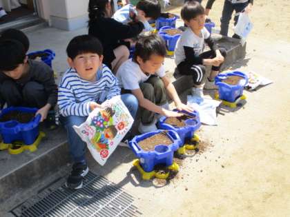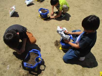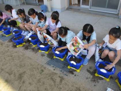 アサガオの種を植えました。肥料を混ぜてから、「よく育ちますように」と願いを込めて植えました。その後も、「もう芽が出たかな」と心配する子供たちがとても愛らしかったです。