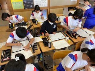 図画工作科で、水墨画をしています。描き直すことができないので、苦戦しながら取り組んでいます。