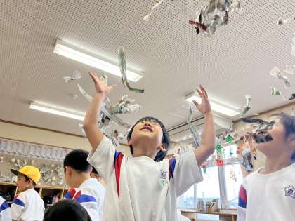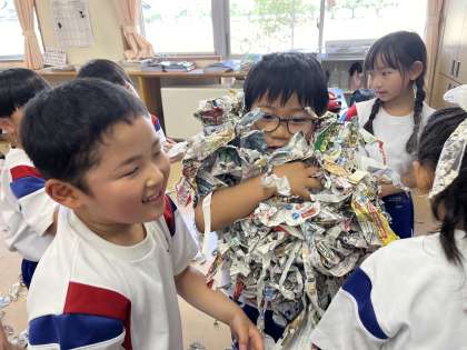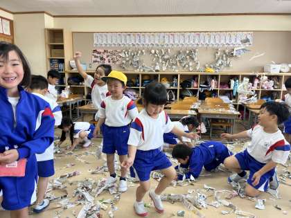 1年生 校外学習のかわりに・・・ パート2 公開日 2024/05/16 更新日 2024/05/16 1年生 音楽に合わせて新聞紙をちぎって遊びました。リズムに合わせて、新聞紙を細長い形や細かくちぎっていました。ちぎった新聞紙を集めて、上に向かってふわっとさせて新聞紙のシャワーにしたり、あふろや髪飾りに見立てて友達と楽しく活動する様子が見られました。