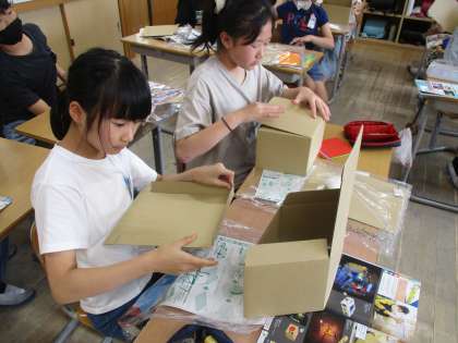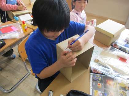「のぞいてみると」の学習で、ダンボ−ルの中に自分なりの世界をつくりました。
