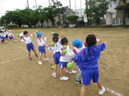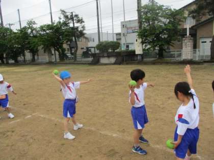 1年生 体育科 ソフトボール投げの測定に向けて 公開日 2024/05/22 更新日 2024/05/22 1年生 体力テストのソフトボール投げの測定に向けて、測定に使うソフトボールよりも少し大きくて、柔らかいボールを使ってボールを投げる練習をしました。投げ手とは反対の腕を斜め上に向けたり、腕を大きく回したりすることを意識して取り組みました。