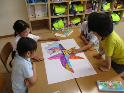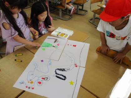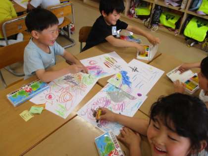 1年生 図画工作科 せんのぼうけん 公開日 2024/05/23 更新日 2024/05/23 1年生 マジックで4枚の画用紙に自由に線を引き、その線から想像を広げてクレヨンで絵を描いたり、色を塗ったりしました。そして、それぞれが担当した画用紙を最後に組み合わせました。そのときにできた絵を見てみんな楽しみました。