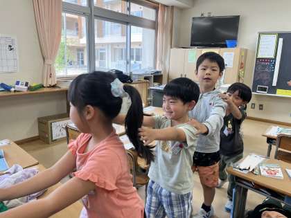 音楽科の学習では、音楽を感じ取る学習をしています。今日は、曲に合わせて手拍子で拍を感じ取りました。身体をゆらゆらと揺らしていたり、友達と一緒に手を合わせてハイタッチしている様子が見られました。歌の様子を浮かべながら活動している中で、「先生!教室の中を歩いてみたい!」と話している子がいたので、みんなでやってみることに。何人かの友達とつながって列車に大変身!トンネルをつくるなど、みんなで楽しく音楽を感じることができました。