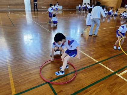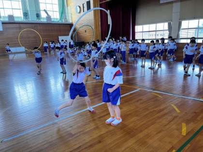 2年生 体育科 新しい団のみんなで協力! 公開日 2024/05/29 更新日 2024/05/29 2年生 2年生になって新しい色団になりました。各団で協力してフラフープを使ったリレーを行いました。「頑張れ!」と仲間を応援する子供たちでした。