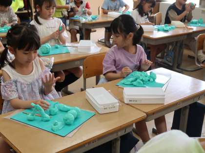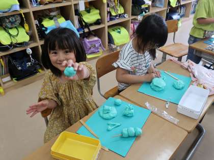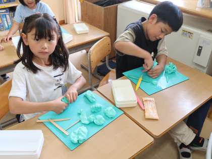 油粘土で食べ物を作りました。アイスクリームやケーキなど、好きな食べ物を一生懸命作っていました。