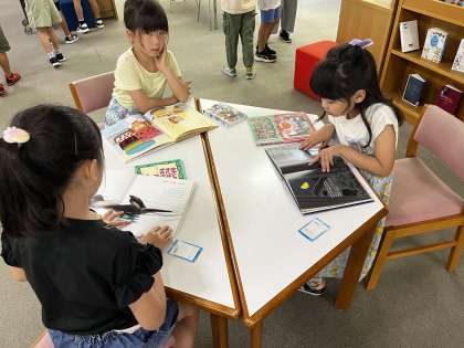 読み聞かせの後は、本の貸し出しを行いました。学校の図書室とは違う本の数々に、子供たちは目を輝かせていました。