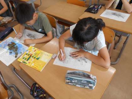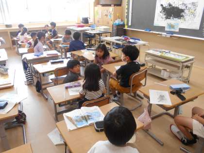 国語科では、スイミーの学習に取り組んでいます。言葉に気を付けて場面の様子を想像しながら読んでいます。