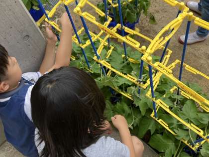 1年生 生活科 わたしのあさがお 公開日 2024/06/17 更新日 2024/06/17 1年生 アサガオが大きくなり、つるが伸びてきたため、支柱を取り付けました。上手につるを支柱に巻き付ける姿が見られました。