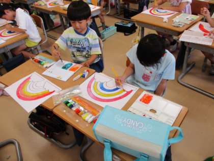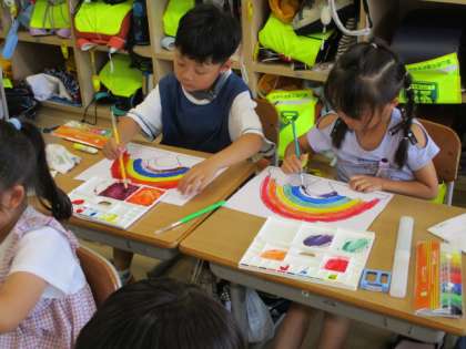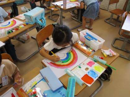 1年生 図画工作科 すいさいでにじをかこう 1 公開日 2024/06/24 更新日 2024/06/24 1年生 水彩の扱いに慣れるために、虹を描きました。赤、青、黄の3色を使って、橙や紫、緑をつくるなど、楽しんで取り組みました。