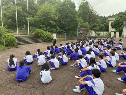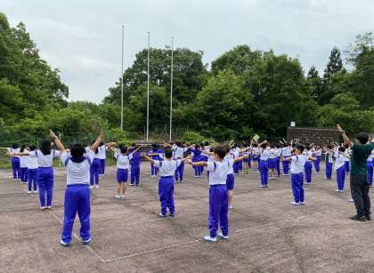4クラスそろっての朝のつどいです。みんなでラジオ体操をして、2日目のスタートを切りました。