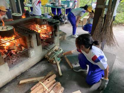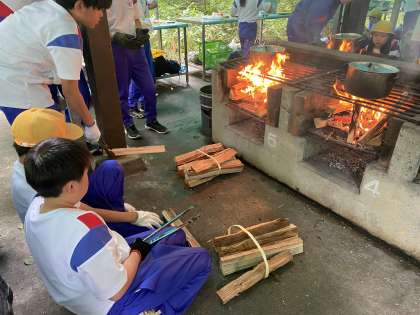 野外調理の様子です。かまど係は暑さに負けず火の管理を頑張っていました。