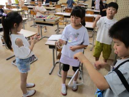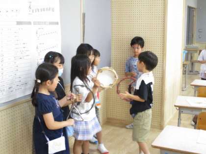 かたつむりの曲に合わせて3つのリズム打ちをしました。3人グループで、楽器とリズムを選び、拍に合わせてリズムを打ちました。