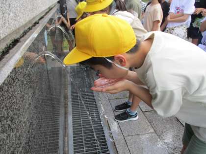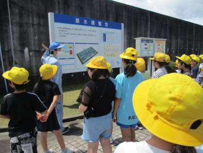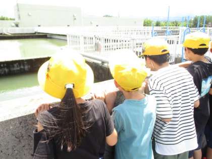 沈澱池やろ過池を見学しました。できたての水をいただき、「つめたくておいしい!」と嬉しそうな子供の姿が見られました。