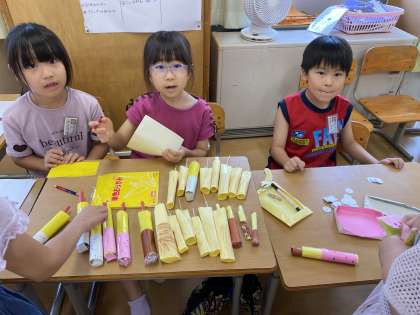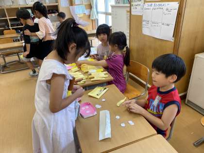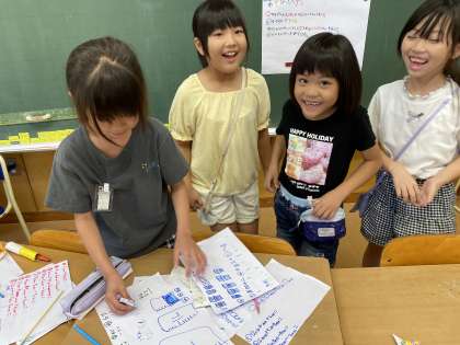 2年1組のお楽しみ会は、ジュース屋さんやたこやき屋さんなど色々なお店を出す「夏まるり」です。お店やさんになったり、お客さんになったりして子供たちは楽しそうでした。2学期が始まったら、2年生みんなでもやりたいと思っています。