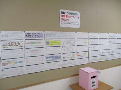 創校150周年記年の横断幕のデザインを子供たちから応募したところ、3年生から6年生の71作品が集まりました。全校児童、教職員による投票で、上位2作品を横断幕のデザインに選ばれました。応募、投票に参加した児童のみなさん、ありがとうございました。
