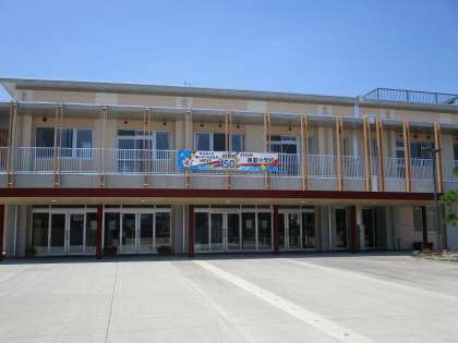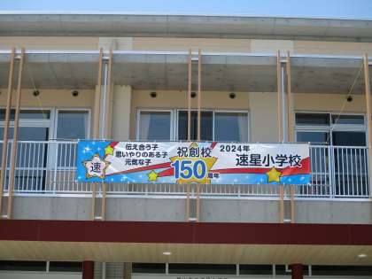 速星小学校児童玄関の横断幕は、4年生児童のデザインを基にしたものです。