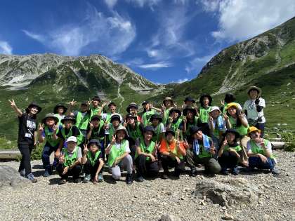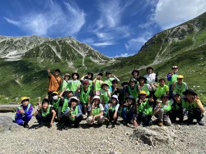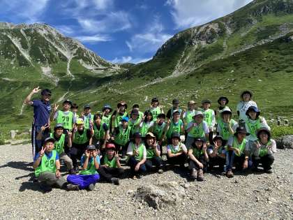 室堂散策をしています。室堂山荘付近の広場で雄山をバックにクラス写真を撮りました。