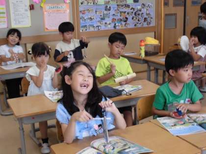 今日の音楽科の授業では、カスタネットやタンバリン、すずの楽器を演奏しました。「どんな音がする?」と聞くと、「たっかたか」「ぱりんぱりん」「しゃらしゃら」など、面白い表現がたくさん出てきました。