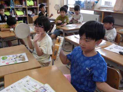 新たにウッドブロックとトライアングルを演奏してみました。初めて見るウッドブロックに興味津々の子供たち!想像していた音と違ったようで楽器の音の違いを楽しんでいました。