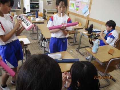 休み時間に音楽会の練習をしている子供がいました。音が聞こえると、どんどん仲間が増えていきました。