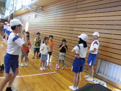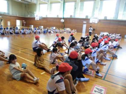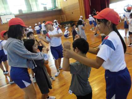 1、6年生合同体育 150周年ダンスにチャレンジ!【パート1】 公開日 2024/09/26 更新日 2024/09/26 1年生 1年生の体育科では、150周年ダンスを覚えて楽しく踊ることに取り組んでいます。 今日は、1、6年生合同で150周年記念ダンスの練習を行いました。色団ごとに踊るパートやダンスが異なるところがあり、かっこいい6年生のお兄さん、お姉さんによるレクチャーを受けました。1年生に合わせて優しく教えてくれる6年生。目をキラキラさせて一生懸命踊っていました。